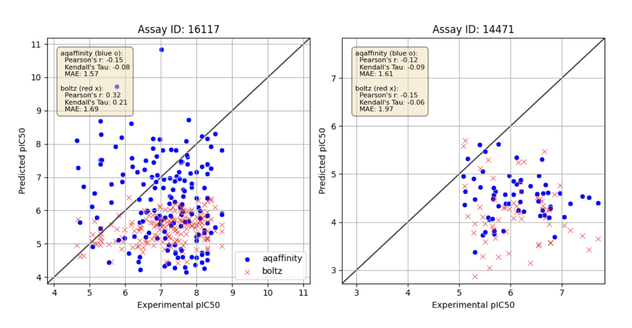 Model performances for these assays are significantly worse for both Boltz2 and AQAffinity. This illustrates further opportunity to improve generalization, which we will pursue in our later releases.